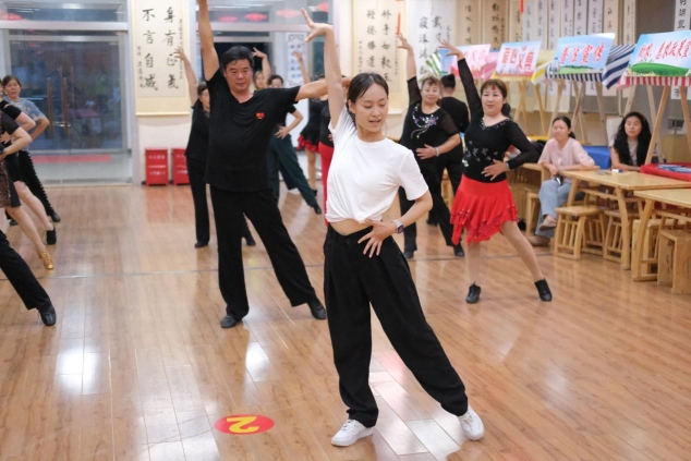 54岁的李阿姨起初因腿脚不便有些拘谨,队员小陈便握着她的手数着节拍:“一二恰恰恰,转身时慢慢移重心”,经过半小时练习,李阿姨已能跟着音乐完成整套基础动作,脸上露出了孩童般的笑容。教室里,老人们时而相互纠正手势,时而笑着调侃彼此的 “小失误”,原本寂静的课堂变成了充满活力的乐园,汗水浸湿了发丝,却挡不住眼中闪烁的热情。