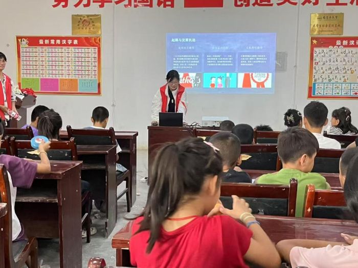 另一处场地里,实践团队成员正为孩子们带来一堂生动的汉语课。墙面贴着“最新常用汉字表”,“日月年水”“大小上下”等基础汉字清晰罗列,为孩子们的学习搭建了便捷的阶梯。课堂上,志愿者们用猜字谜、情景演绎等趣味互动引导孩子们认读,细细讲解汉字背后的文化意涵。孩子们瞪着好奇的眼睛专注听讲,时不时高高举起小手提问,清脆的童声与温和的讲解交织,让课堂充满活跃融洽的气息。