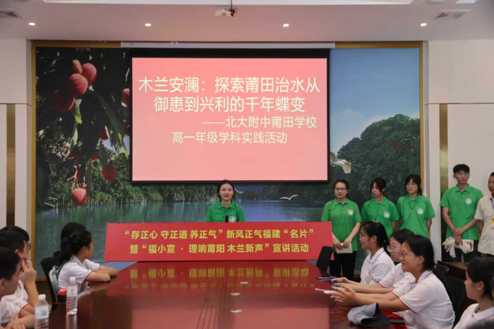 青春宣讲:播撒生态文明的种子带着满满收获与深刻感悟,实践队在木兰溪治理展示馆为北大附中莆田学校高一年级学生带来主题宣讲交流会。队员结合参观见闻和采访故事,向中学生们讲述了木兰溪治理的非凡历程和其中蕴含的宝贵精神。宣讲后的互动环节,提问引发了热烈讨论,实践队员还展示了团队设计的木兰溪治理主题Logo,并将印有该Logo的文创针织袋赠送给参与的中学生。这场宣讲,不仅传递了知识,更在年轻一代心中悄然播下了守护绿水青山的种子。