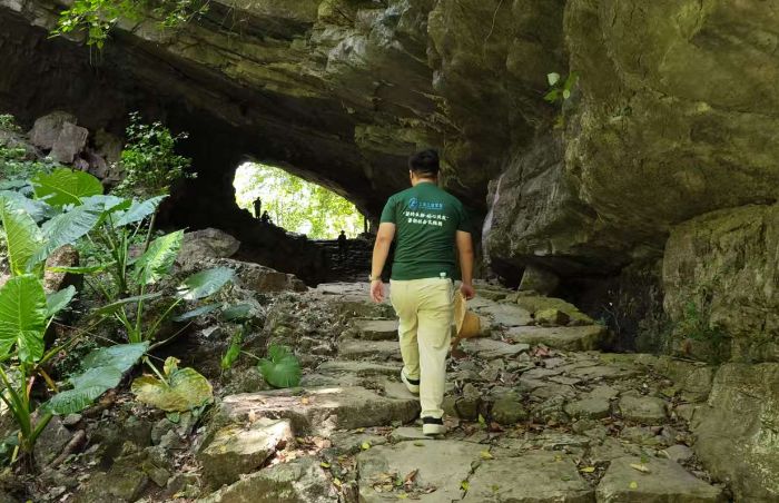 7月19日,实践团重走穿岩古道。这条开凿于明嘉靖年间的青石板路,曾是连接桂北与黔东南的“茶盐古道”,见证了古代商贸的繁荣与民族交流的盛况。在海拔300米的悬崖处,一道天然岩洞贯穿山体,形成奇特的“城门”景观。
