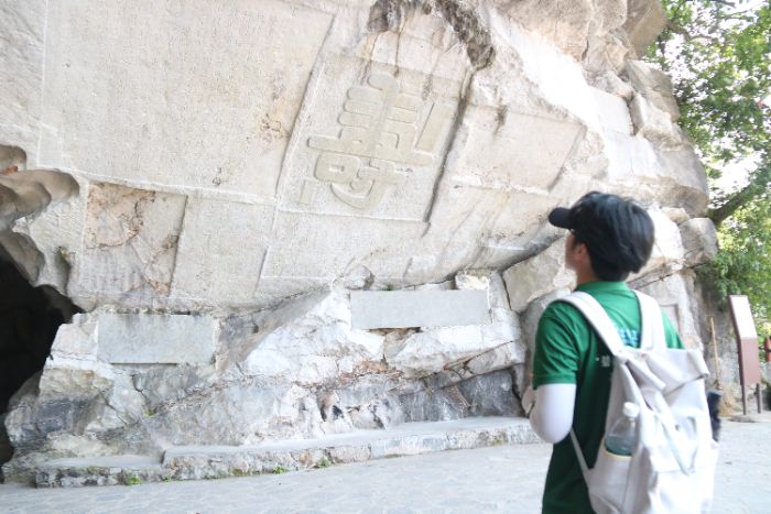 百寿岩的‘寿’字不是刻出来的,是‘长’出来的!7月18日下午,在百寿镇文化站站长带领下,实践团来到著名的百寿岩石刻前。岩壁上111个不同字体的“寿”字组成巨幅榜书,其中最大的楷体寿字高1.75米,相传为南宋知县史渭手书,被誉为“中华寿文化瑰宝”。