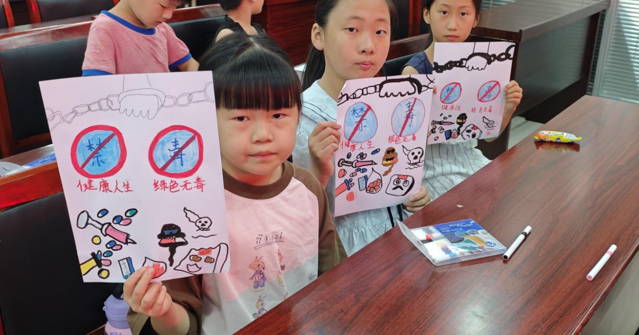 图为社区小朋友们完成的禁毒绘画 赵想通讯员摄