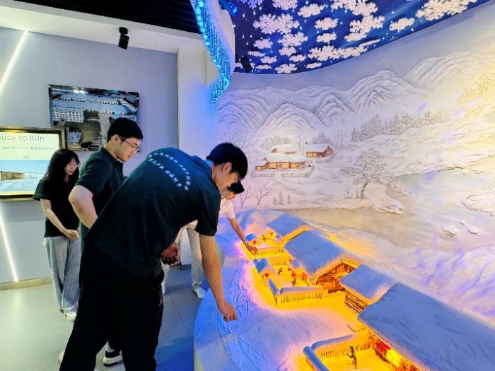 来到电子滚动卷轴前,实践队成员随着展卷节奏,细看关于海林森林资源、特色农产品的介绍。“猴头菇”、“黑木耳”等特色标签旁的注解,让队员们结合专业讨论:“这些优质农产要走出大山、特色木材要精深加工,交通物流的畅通与仓储设施的完善是关键支撑。”转至园区风采区,屏幕上正播放智能菌菇生产线的忙碌场景,展架上陈列着特色农产品的深加工制品。队员们明晰:“从资源到产业的跃升,离不开物流网络的搭建与生产设施的优化,这些正是土木交通专业可以发力的关键环节,也是我们用专业能力为“好资源”蜕变为“好产业”筑牢的支撑。”