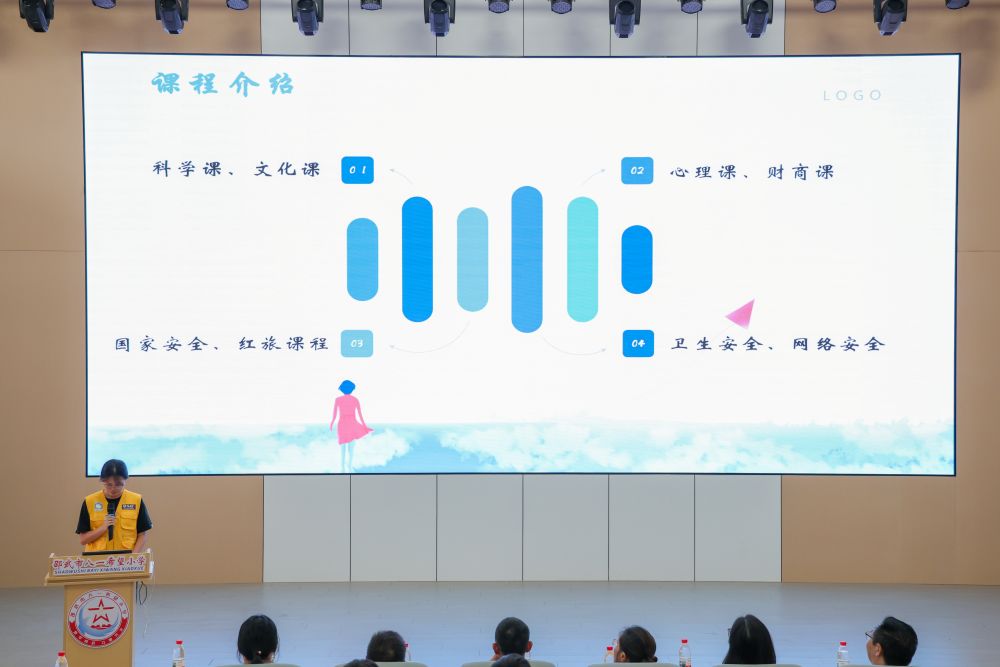 副校长张世贤致辞结束后,厦门大学嘉庚学院会计与金融学院青年志愿者队队长陈乐彤上台,详细介绍了此次夏令营的课程规划。她表示,本次暑期兴趣课程班将以嘉庚精神中“忠、公、俭、诚、毅”的丰富内涵为引领,精心设置科学探秘、文化浸润、心理护航、财商启蒙、国家安全、红旅课程、卫生防护、网络安全八大主题课程。课程将在拓展课外知识的基础上,融入趣味实验、互动游戏、实践体验等多元形式,让孩子们在轻松愉快的氛围中拓宽视野、收获知识,度过一段充实而有意义的时光。
