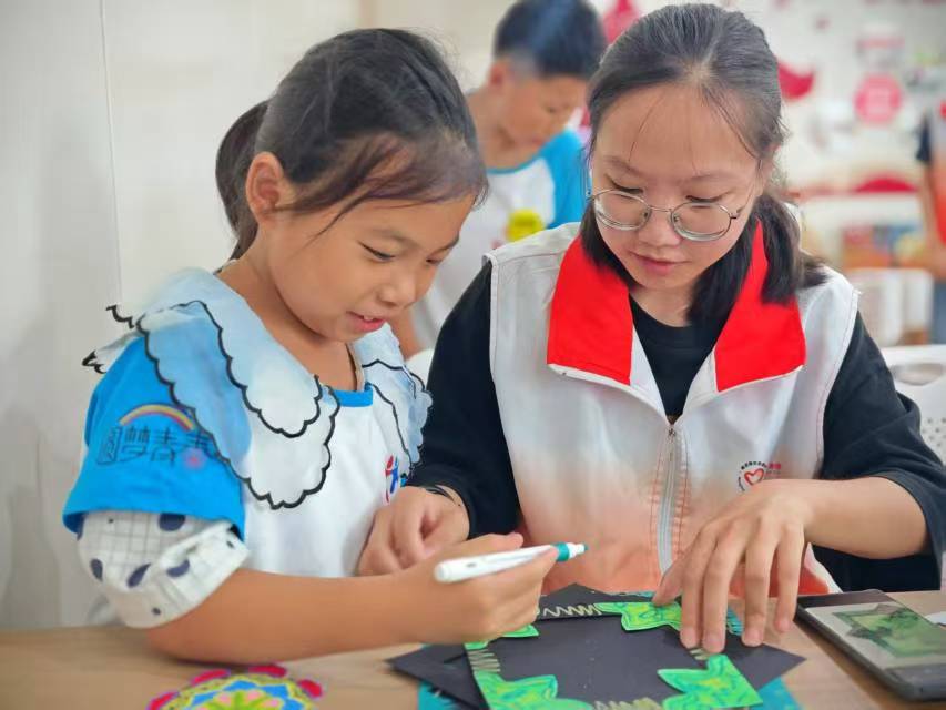非遗手工承文化 非遗课堂上,孩子们在志愿者指导下创作藻井图案手工画。从绘制纹样到拼贴装饰,志愿者们耐心指导,孩子们尽情发挥想象力。一幅幅色彩斑斓的作品不仅展现了童真创意,更传递了对中华传统文化的热爱与传承。