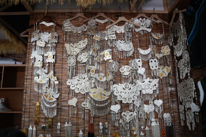 店铺临街区域,左右两排着衣模特整齐陈列,后排货架上层层叠叠挂满风格各异的彝绣服装;再往里走,则是琳琅满目的耳饰、头饰等饰品区。