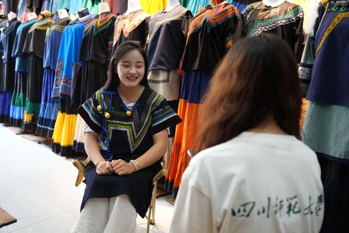 介绍完店内服装后,阿克拉送接受了高丛莉的采访,围绕彝绣服装的制作过程、销售渠道、受众群体及传承现状等话题展开交流。在采访中她说,目前“彝色非遗”的销售以线上渠道和服饰出租为主,因为线上市场空间更广阔。近年来互联网的发展,也让越来越多各地区各族的年轻群体爱上彝绣服饰,这使得许多老旧彝绣衣物重焕生机。