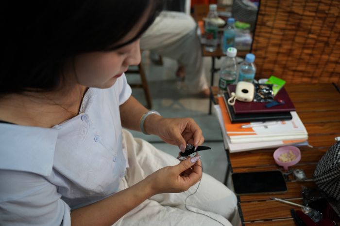 (图为阿克拉送为筑梦队员绣编发卡。孙妮供图)
