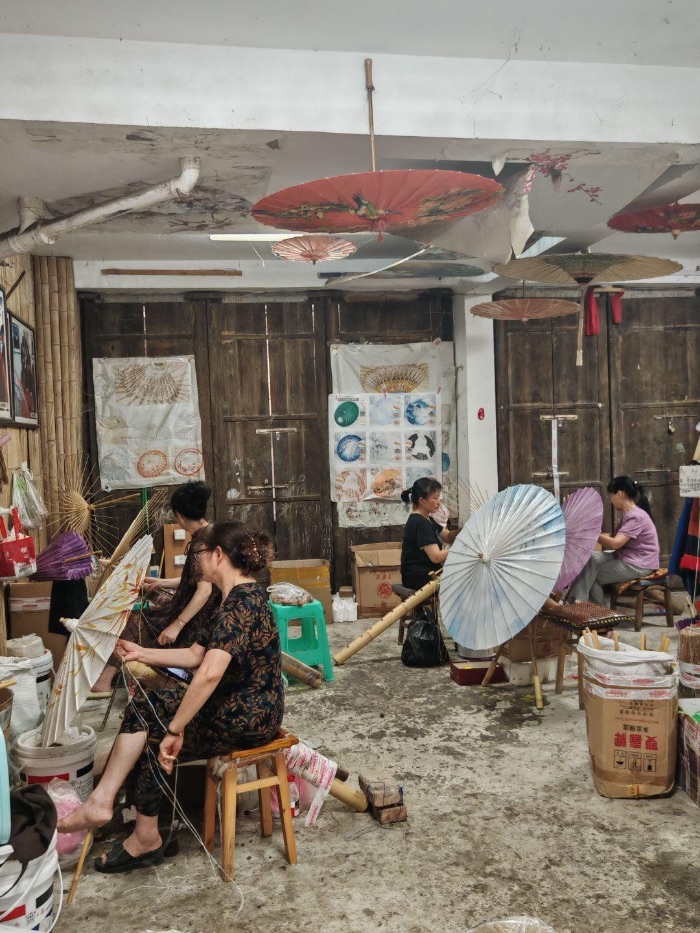 交流中,提及线上销售平台运营情况,负责人介绍正在通过社交媒体推广产品。谈及产品定义转变,他指出油纸伞多应用于拍照、家居装饰等场景,实用功能已转向文化消费载体。作为国家级非遗项目,当地政府通过组织非遗节等活动对油纸伞进行推广,并提供资金助力油纸伞产业发展。该工坊作为当地特色产业载体,其生产活动直接带动周边村民参与原材料加工。晾晒区排列的油纸伞泛着微光,见证着手工艺与乡村发展的共生关系——以传统技艺为底色,绘就乡村振兴新蓝图。