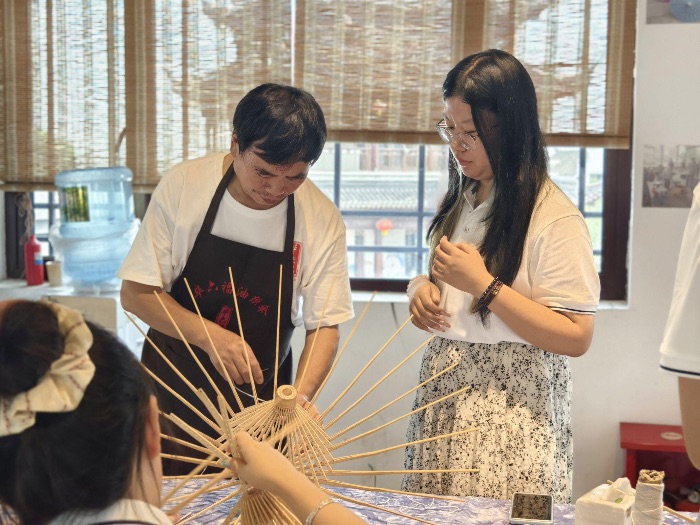 在相关负责人的带领下,实践队在分水岭镇老街油纸伞工坊进行实地调研。工坊负责人向实践队员们介绍了油纸伞的生产情况,匠人们现场展示伞骨穿线,穿插竹篾构成稳定结构,随后又着手裱纸作业,将棉纸贴合于伞架。
