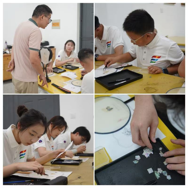 匠心实操润初心,亲身体验强认同 在扬州漆器厂,队员们亲身体验了螺钿漆扇制作。在专业老师的指导下,他们认真完成贝壳切割、图案镶嵌等工序。工作人员强调“切割要稳,镶嵌要准”,让大家深刻体会到“技在手中,艺在心中”的非遗精魂。通过亲手创作,队员们对这项于2006年列入首批国家级非物质文化遗产的工艺价值,有了更为真切的感悟。