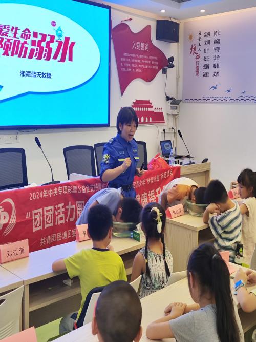 为增强暑期青少年的防溺水安全意识,下午,由“童心映湘·剧燃红魂”志愿服务队邀请到的湘潭蓝天救援队走进长塘社区,开展了一场主题为“珍爱生命,预防溺水”的安全教育活动。救援队员采用互动提问的方式,巧妙引出游泳“十不准”原则,结合真实溺水案例,用通俗易懂的语言深入剖析溺水的危害性,让孩子们深刻认识到防溺水的重要性。