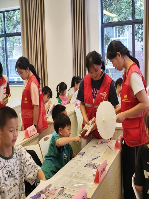 7月9日,湘潭大学“童心映湘·剧燃红魂”志愿服务队走进湘潭市宝塔街道长塘社区,开展作业辅导、围棋课堂及非遗油纸伞DIY等系列活动,丰富青少年暑期生活,解决家长“看护难”问题。