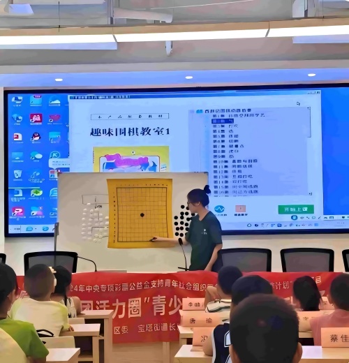 同步开展的围棋课堂由服务队智力拓展组专业主导。开班仪式上,志愿者以"尧造围棋,教子丹朱"的典故开篇,阐释围棋"围而相杀,争得共存"的哲学智慧。实战环节采用服务队创新研发的"段位进阶卡" :从"气"的概念解析到"打吃"技巧演练,孩子们在十九路棋盘上运筹攻防。服务队员俯身对弈台旁,以"一棋一解"的互动教学,让抽象棋理化为具象思维训练。