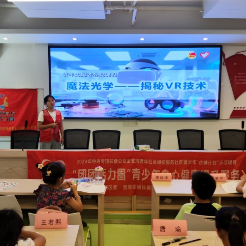 “童心映湘”团队还给小朋友们带来了“魔法光学——揭秘VR技术”互动展。孩子们在志愿者讲解中了解了VR技术背后的光学原理。深刻领悟到了科技的魅力,“通过VR学知识,像在玩游戏!”一名男孩赞叹道。