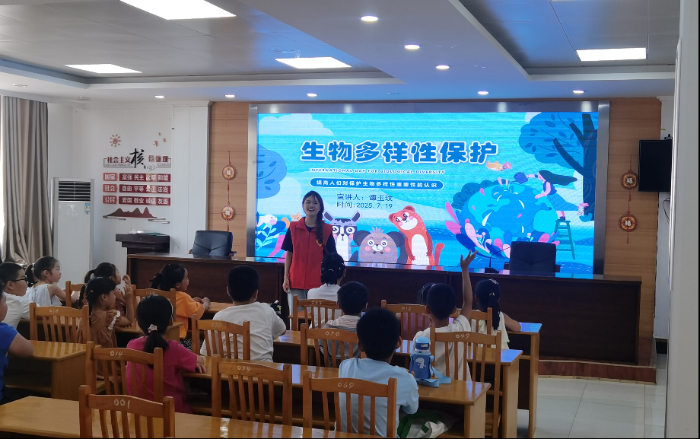 志愿者谭玉玟的生物多样性科普课,从“人类与生物相互依存”的概念切入,用生动案例讲解生物多样性的直接价值、间接价值和潜在价值。当讲到生物多样性锐减的现状及栖息地破坏、环境污染等原因时,孩子们脸上露出担忧;而在讨论“如何保护生物多样性”时,大家积极献策,从“节约用纸”到“不伤害小动物”,稚嫩的想法里满是对自然的珍视。
