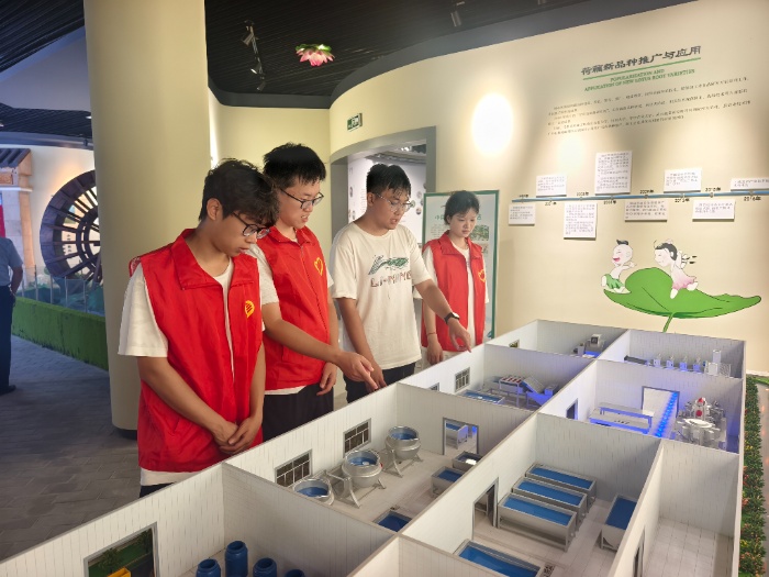 7月16日,团队前往扬州市宝应县,开启了宝应荷园的调研之行,并参观了荷藕展示馆,深入了解当地藕产品的发展史以及特色藕制品的制作工艺。“荷叶罗裙一色裁,芙蓉向脸两边开”,宝应荷园的万亩荷塘既是令人沉醉的诗意画卷,更是当地特色产业最生动的“活教材”。行程中,团队乘小船轻划而入,船桨搅碎水面的倒影,层层叠叠的荷丛在两侧徐徐展开,清香漫过船舷。在荷藕展示馆中讲解员细细道来:这片荷塘不仅孕育着脆嫩得能掐出汁水的鲜藕,更催生出藕粉、藕夹等20余种加工品,每一种都凝结着当地人代代相传的匠心。队员们凝视着传统工艺里透着温度的慢工细作,又注视着现代科技下高效运转的流水线,真切体会到“小藕节”里藏着的“大产业”:从田间泥土里的鲜藕,到餐桌瓷盘里的佳肴;从祖辈手作的老手艺,到科技赋能的新生产,这枚小小的藕,早已串联起一条贯通古今、充满活力的产业链。