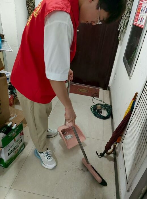 文澜青行团小队成员在清扫居民门口的垃圾王艺洋供图