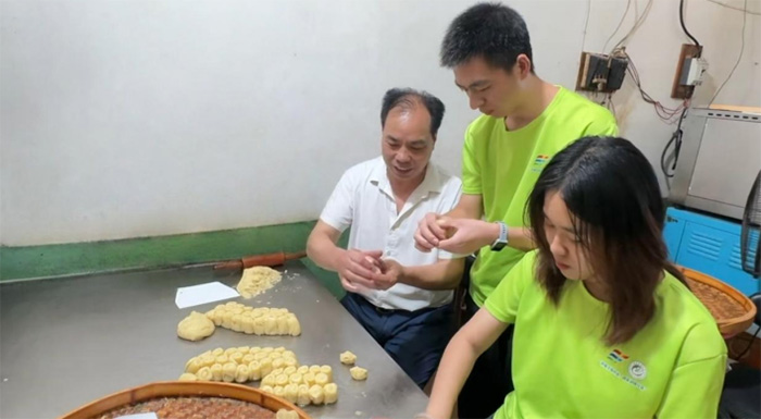 图为实践队成员在绿豆饼工艺传承者的带领下制作绿豆饼 通讯员 杨依濛/摄