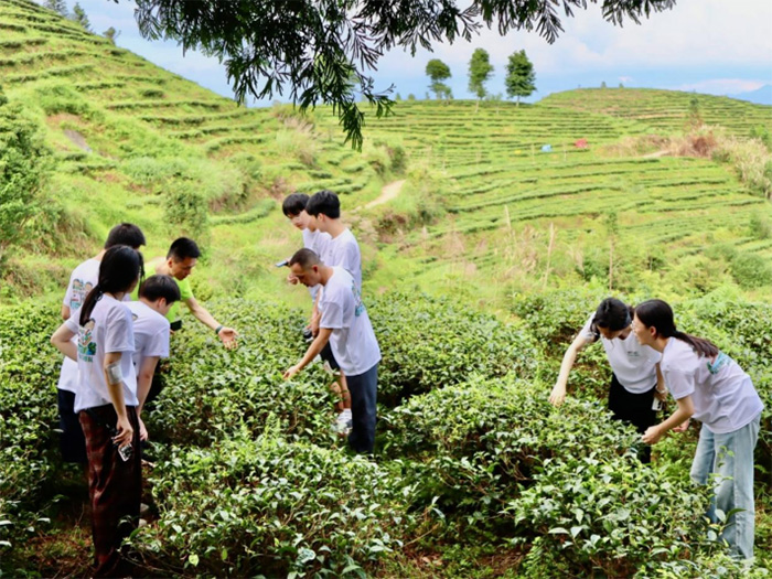怀揣兴农热情与对茶山的向往,实践队成员们走进大田县屏山乡内洋村海拔1100米的茶山。队员们穿行于层层叠叠的茶树间,指尖轻触沾着晨露的嫩芽,聆听自然与茶的共生哲学。在茶叶科技系刘晓龙老师和辅导员黄国栋老师的讲解下,队员们探寻大田美人茶的优质密码:茶小绿叶蝉的叮咬刺激茶树分泌特殊物质,赋予茶叶独特香甜风味;当地云雾缭绕、昼夜温差大、土壤肥沃等自然条件,更让茶叶积累丰富养分。在屏山云雾漫卷茶垄、山风轻拂新叶中,青年学子们坚定了用所学知识助力茶产业发展、投身乡村振兴的决心。