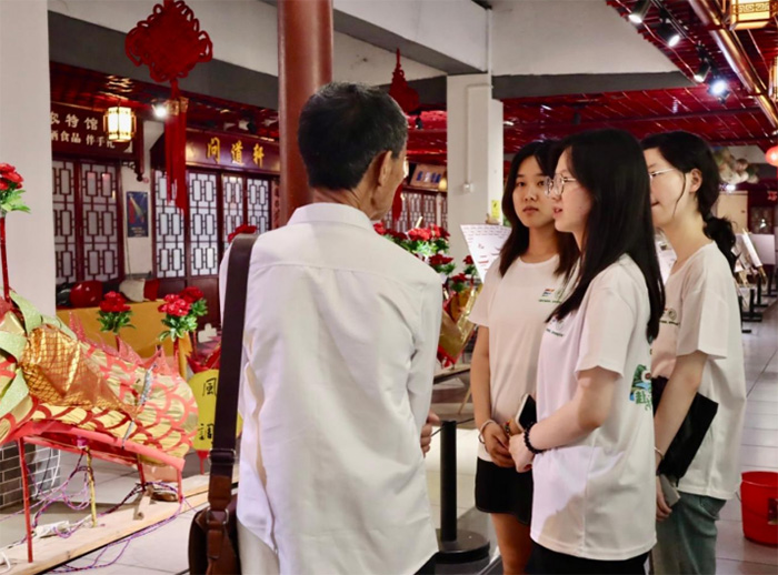 图为实践队成员与当地村民交流国家级非物质文化遗产——板灯龙 通讯员 杨芷怡/摄