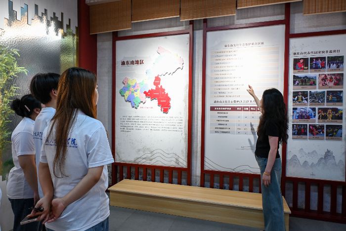 上午,团队齐聚濯水古镇渝东南非遗馆,开启文化寻访之旅。馆内珍藏着土家族、苗族等民族丰富的文化遗产,是了解黔江文脉的重要窗口。在讲解老师带领下,成员们首先熟悉了展馆布局,随后逐一深入文化生态保护区介绍、非遗项目展示区和非遗手艺体验区。