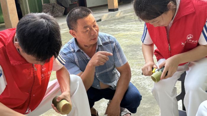 为了让成员们更系统地学习到“过山号”的制作技巧,马师傅详细演示了“三分之二衔接法”的套接工艺,团队成员分组协作,按照马师傅所说的制作步骤和注意事项,逐步完成削薄竹筒、榫卯套接、水浸定型等工序。在学习初期因为技巧难以掌握,队员们略显生疏,但在马师傅的耐心指导下,最终成功制作了三支“过山号”。