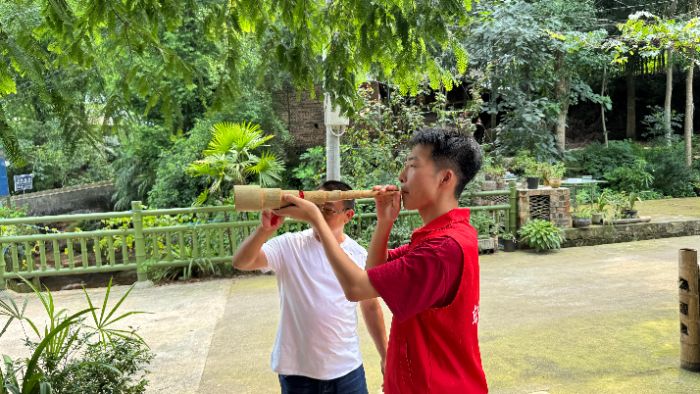 亲践匠心:共护濒危非遗技 在专题采访中,团队成员深刻感受到“过山号”制作技艺面临的传承困境。尽管其音色浑厚、工艺精巧,但由于学习门槛高、传播范围有限,年轻一代对其知之甚少。为此,团队决定策划一场“从选竹到吹奏”的全流程体验活动,以实践促传承,以互动扩影响。