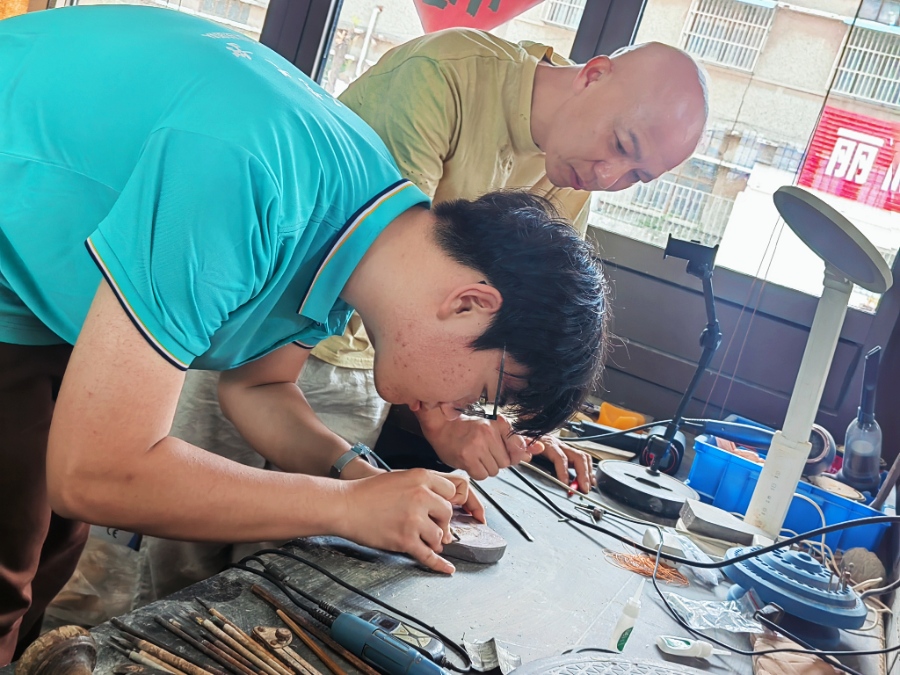 在雕刻体验环节,冯师傅在现场展示了精湛的紫金石雕刻技艺并传授队员们雕刻手法和经验。他坦言:“一方好砚,选材是基础,雕刻是灵魂。”其工作室中陈列的《起舞弄清影》《竹影酌意》等代表作,既完美融汇传统技法精髓,又巧妙注入现代审美意趣,古朴中透出灵动生机。学子们凝神观摩,在刀石碰撞声中真切体会到“台上一分钟,台下十年功”的匠心真谛。