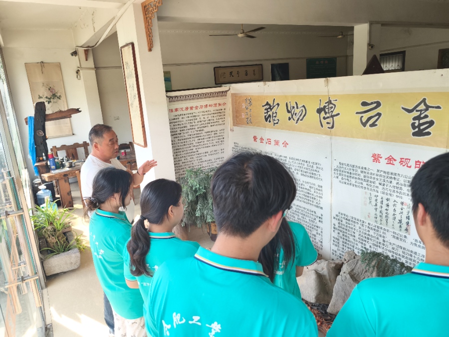 当日下午,团队在淮南汉唐紫金石博物馆馆长应伟的引领下,开启了一场穿越时空的文化之旅。步入展厅,琳琅满目的紫金石砚,从古朴汉风到雅致唐宋,无声诉说着历史变迁。应馆长引导学子们细辨砚台的独特石质——“质坚而润,色紫而雅”,解读其背后蕴含的文化密码与历史故事。