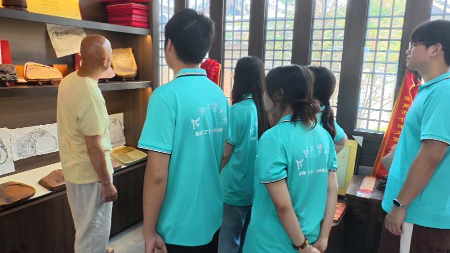 当日上午,团队拜访了紫金砚制作技艺省级代表性传承人冯长文先生。冯先生如数家珍般讲述了紫金砚的千年渊源与兴衰历程。结合数十年经验,他系统解析了从选材、构思、雕刻到打磨的完整工艺流程,其深厚的专业素养令学子们深刻感受到紫金砚承载的历史厚重与匠人智慧。