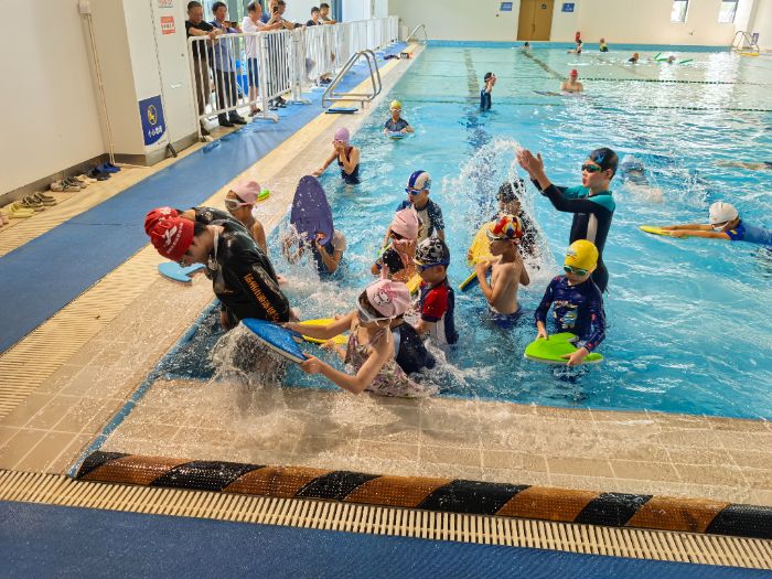 在教练和实践团成员们的鼓励下,孩子们慢慢克服了恐惧,勇敢地走进水中。志愿者们时刻关注着孩子们的安全,在一旁保护着他们。孩子们从漂浮、划水等基础动作学起,一点点进步。当他们能够在水中游出一小段距离时,脸上都露出了兴奋的笑容。教练和孩子们在水中互动频繁,其乐融融,整个泳池都充满了欢乐的气氛。