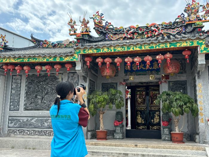 康氏祠堂内,实践队与这座百年古建筑展开了一场跨越代际的对话。梁架间的金漆木雕流光溢彩,屋顶的嵌瓷在光影中熠熠生辉,墙壁上的石雕栩栩如生——这些精美的潮汕传统工艺,不仅是宗祠的华丽装点,更承载着当地居民对先祖的崇敬之心,以及对本土文化的深刻认同与代代传承。