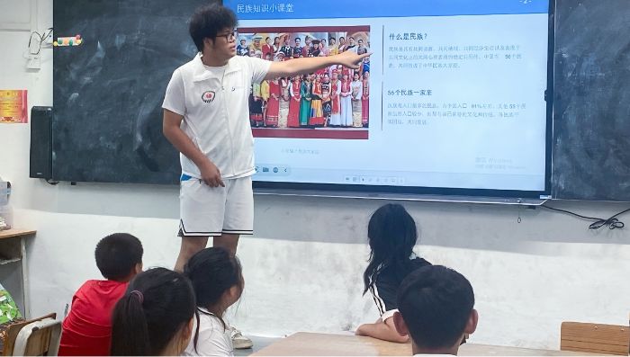图为老师介绍民族知识+“籽籽同行”突击队摄