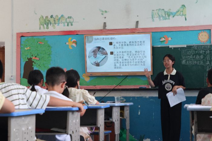 课程中,支教团黄欣妍简化法律基础知识,以 “保护与约定” 为核心,告诉孩子们法律能规范行为、保护受欺负的人,还通过拍手游戏帮助孩子们理解 “权利与义务”—— 既有被照顾的权利,也有不欺负他人的义务。对于青少年相关法律,她用形象的语言讲解了出行年龄限制和未成年人犯罪的刑事责任规定,让孩子们知晓自身需被特殊保护,同时也要规范自身行为。