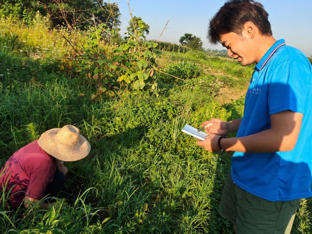农田旁的对话:实践团问记农事,解农技之困疑 当日,实践团成员身着统一队服,深入田间地头。在一处农田旁,实践团员遇到正在劳作的农民,他主动上前交流,指着农田询问种植作物、灌溉方式及病虫害防治情况。农民也十分热情,同样提出了种植时遇到的难题:“这季水稻,玉米长势都不错,就是遇到病虫害时,不太懂新防治办法。” 实践团员结合所学知识,耐心讲解科学防治要点。根据当地7月农作物生长周期资料,细致观察水稻孕穗期株型、玉米拔节期高度与叶片状态,以寻求最佳应对方法。他们用手机记录作物生长细节,对照资料梳理土壤墒情与长势匹配情况,轻声探讨实际景象和理论描述的差异。这场田间考察,让课本理论在土地滋养下“活”起来,也为次日深度交流,梳理出具体问题清单。