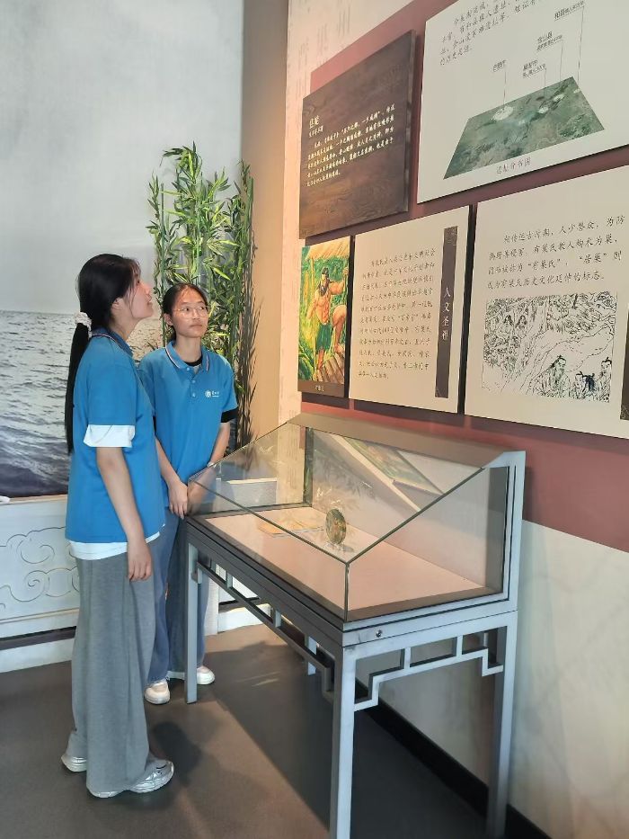 馆内,实践团成员们有序参观。在陈列着地方历史文化与名人事迹的展区,两名身着蓝色队服的女生驻足于展板前,其中一人指着展板上的人文故事,与同伴交流探讨,手中纸笔不时记录。