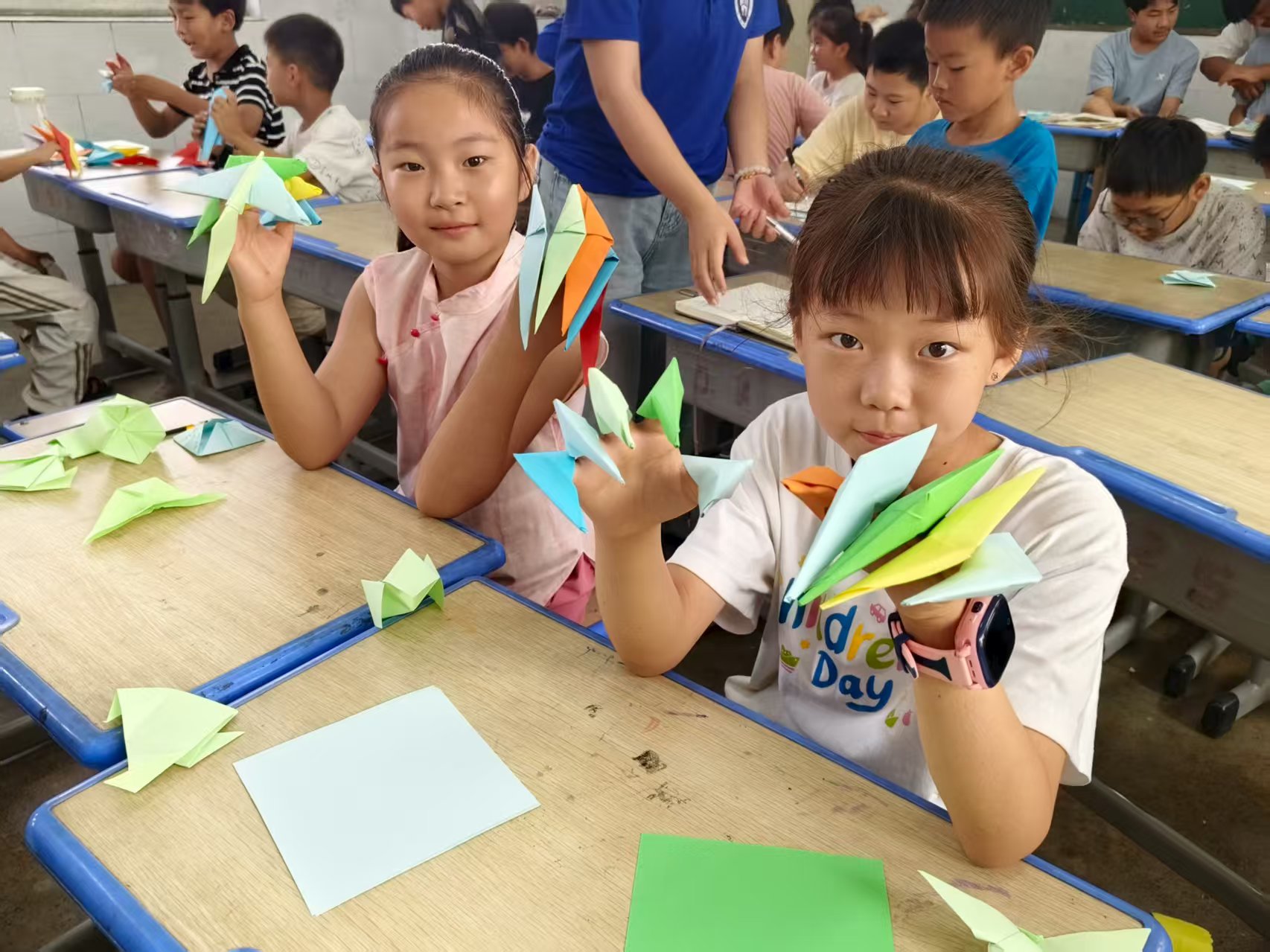 图为孩子们展示折纸成果,任巧雨供图