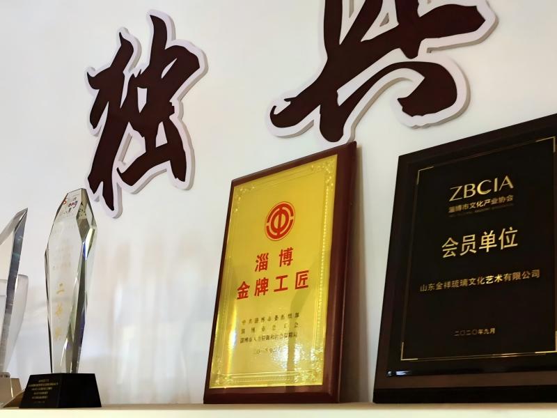 通过工作人员介绍,实践团成员了解到,博山金祥琉璃文化艺术有限公司是琉璃艺术领域的卓越企业,专注于琉璃文化传承与创新。公司荣获山东手造·优选100等多项荣誉称号,是省级工业旅游示范基地、非遗传习所。拥有实力雄厚的专业研发团队,培养众多行业大师。其作品多次斩获“金凤凰”金奖、中国玻璃艺术名家作品展金奖等大奖。同时,积极发掘保护胭脂红琉璃烧制技艺,为琉璃艺术的传承与发展作出重要贡献。