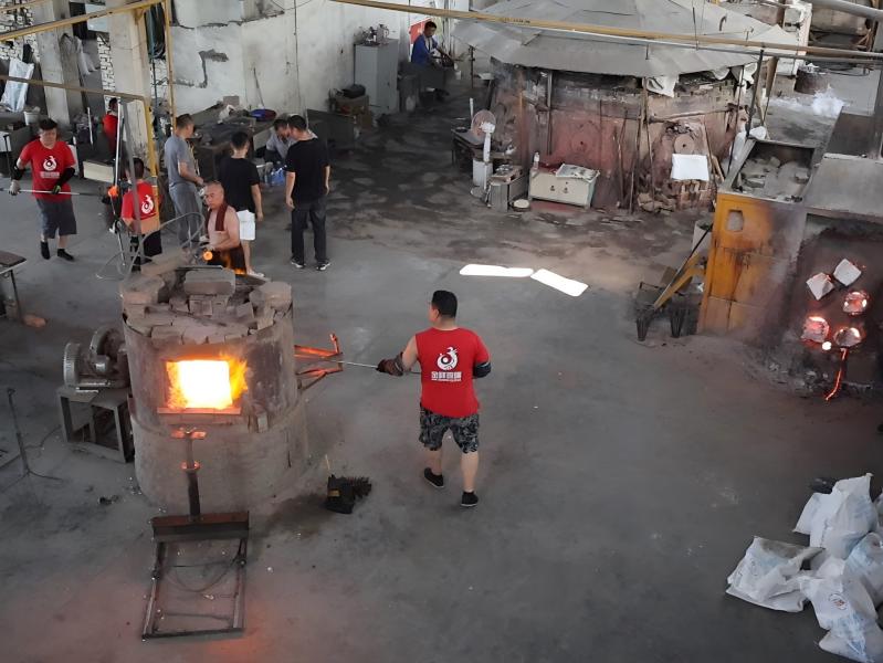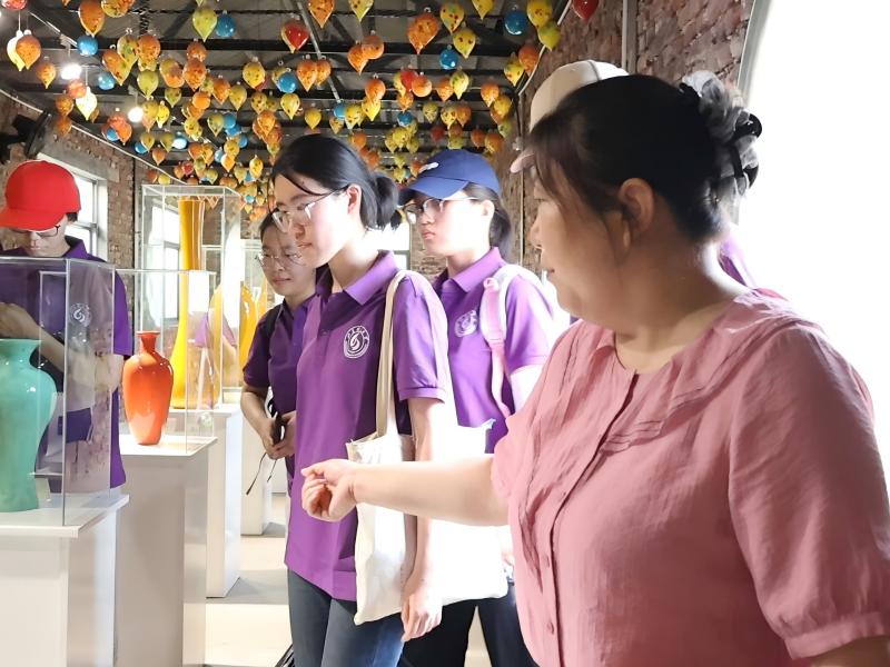 深入调研过程中,工作人员带领实践团成员参观了琉璃非遗展厅与生产工坊,详细讲解了博山琉璃“火里求财”的独特工艺——从石英砂、长石等原料的精准配比,到1400℃高温下的吹制塑形,再到冷加工阶段的雕刻、描金等精细工序。匠人们手持长杆在烈焰中精准把控琉璃的流动形态,一件件晶莹剔透的瓶、盏、摆件在巧手中逐渐成型,让实践团成员直观感受到传统技艺的温度与力量。