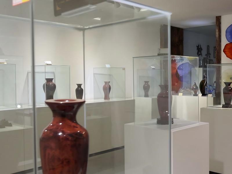 此次调研的一大亮点是新推出的鸡肝石展区。公司工作人员介绍,鸡肝石是琉璃中的“特色瑰宝”,因色泽酷似鸡肝而得名,其制作对原料配比和火候控制有着极高要求。她提到,鸡肝石作为博山琉璃的重要品类之一,承载着当地悠久的历史文化和传统技艺,是博山琉璃烧制技艺这一国家级非物质文化遗产的重要传承载体,展区内的每件作品都蕴含着深厚的文化底蕴。负责人的讲解既有历史背景的追溯,也有艺术价值的剖析,让成员们感受到琉璃作为“立体的诗”的独特魅力。