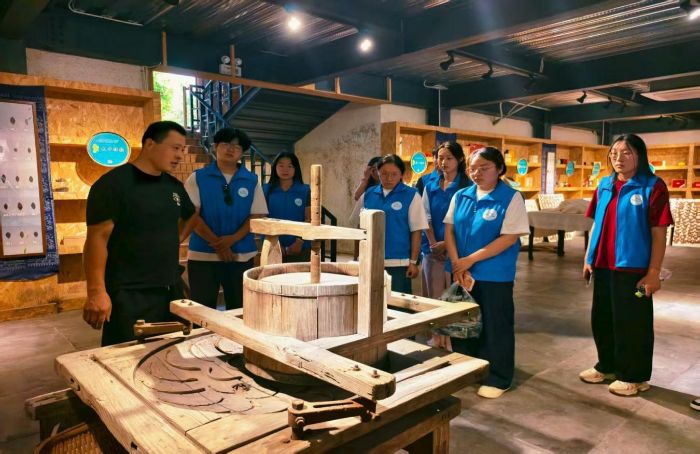 图为实践团成员聆听尹经理介绍制茶工具(蔺晓庆摄)
