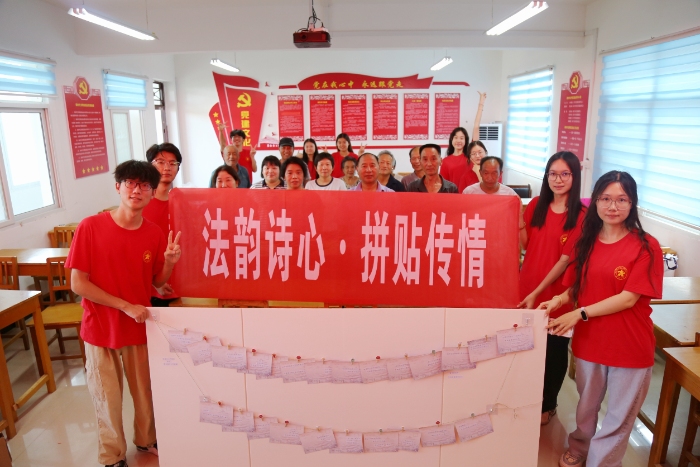 在祁寸湾村的法治文化板上,队员们用画笔将“爱国精神”与法治标语交融,让空白的画板焕发法治活力。在一张张明信片上,村民们制作法治拼贴诗。农民群众用智慧将“留守儿童”“民法典”等等残缺的语句拼出最朴实的法律常识。在进行访谈时,村干部赞扬道:“学生们带来的不仅是法律知识,更是乡村振兴的青春力量。”