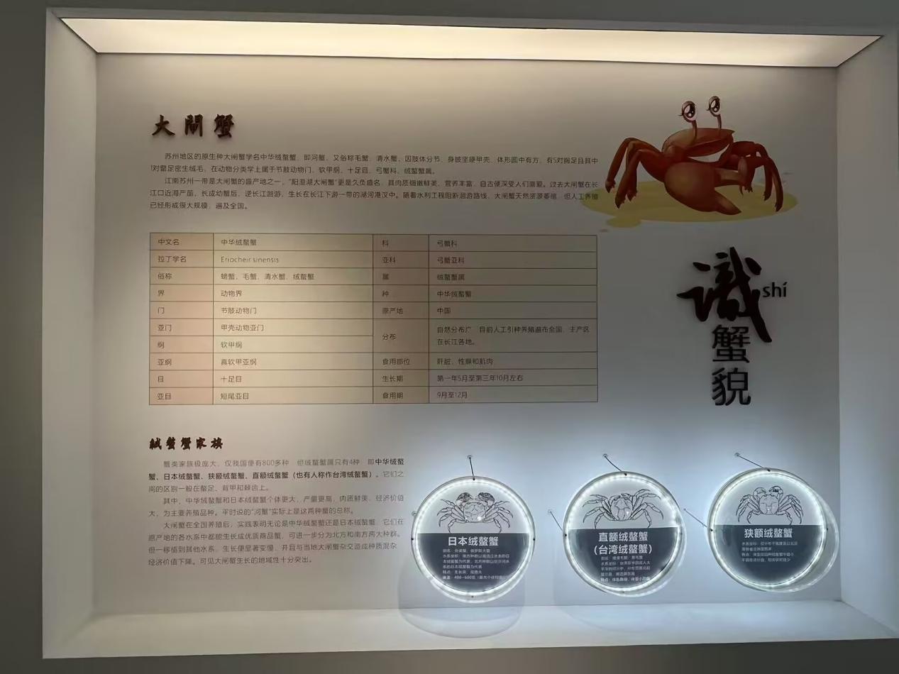 穿过古色古香的村落,团队来到消泾村文化馆。泛黄的老照片、锈迹斑斑的捕蟹工具,生动展现了阳澄湖大闸蟹产业的发展脉络。"这些展品都是村民自发捐赠的,承载着几代人的养蟹记忆。"讲解员介绍,馆内通过互动屏幕展示蟹文化习俗,让游客沉浸式感受水乡风情。这种文化与产业的深度融合,为生态养殖注入了独特的人文内涵。