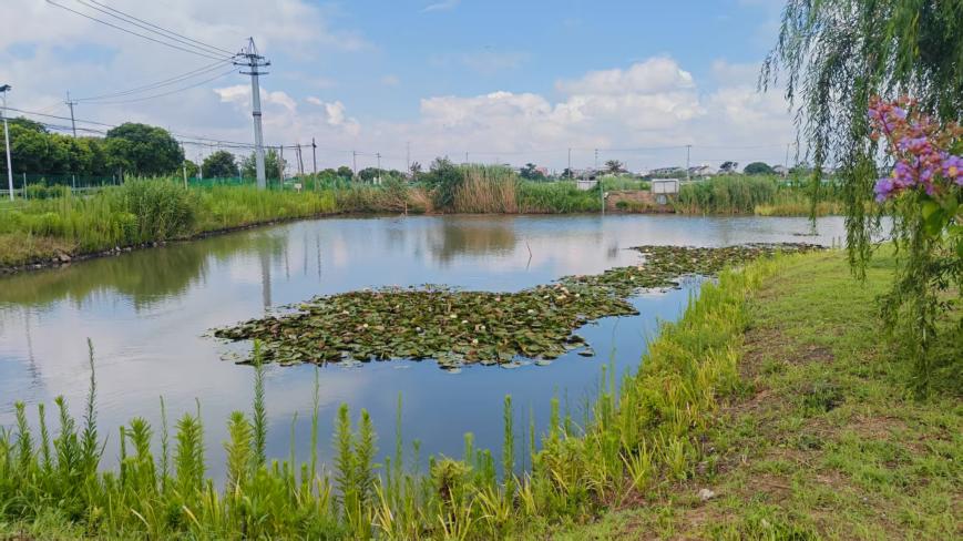 告别企业,蟹逅智水实践团队转赴省级生态养殖示范基地——鹤泾湾养殖基地进行参观。这里的水体澄澈见底,岸边水草丰茂,鱼蟹在模拟自然的环境中悠然生长,是当地重要的螃蟹、鱼虾养殖示范区。团队成员实地参观了养殖塘口,详细了解基地在生态调控、水质管理、病害防治等方面的创新举措。负责人介绍,近年来,养殖基地通过推广“种草养蟹”“鱼蟹混养”等生态模式,不仅提高了养殖效益,还显著改善了水域生态环境。这种“与自然对话”的养殖方式,让绿色发展理念真正扎进了泥土里。