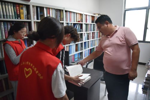 在班村村干部的带领下,实践团首站来到村委会,参观了村委会中的藏书馆、村史馆、党史馆、村民文化活动中心等场地。在藏书馆内,村干部向团队成员详细介绍了记录班村历史与现状的《班村志》。据村干部介绍:“2000年6月班村集体从三门峡市渑池县迁徙到如今的开封市杏花营农场,村两委专门成立专班着手编纂《班村志》,以此留存村落历史记忆,其中详细记载了班村的村庄根脉、水土变迁与名人事迹。”实践团成员认真翻阅《班村志》,深入了解班村的迁徙历程和文化传承,感受到村民对故土的深厚情感。随后,团队参观了村史馆,馆内陈列的老照片和实物生动再现了班村的变迁与发展。通过这些珍贵资料,成员们对乡村振兴的内涵有了更深刻的认识。