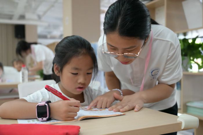 图为志愿者冯小凤为小朋友讲解暑假习题张锡松供图