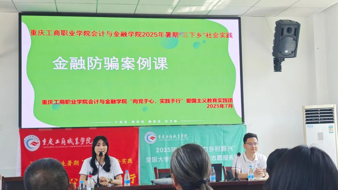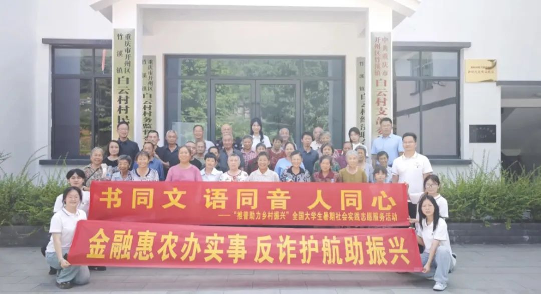下午,实践团来到开州区竹溪镇白云村。队员们首先与村支书、驻村第一书记举行座谈,详细了解白云村在乡村振兴战略实施中的产业发展规划、基础设施升级、村民生活改善等实际情况,并结合专业优势就助力乡村发展路径展开深入探讨。随后,实践团为村民举办反诈宣传与金融知识普及讲座,结合真实案例剖析电信诈骗、非法集资的常见套路与防范要点,普及存款保险、信贷理财等基础金融知识;针对部分村民普通话使用不熟练的问题,专门开展普通话推广教学,通过日常用语示范、场景对话练习等方式,助力村民更好地融入现代生活交流。