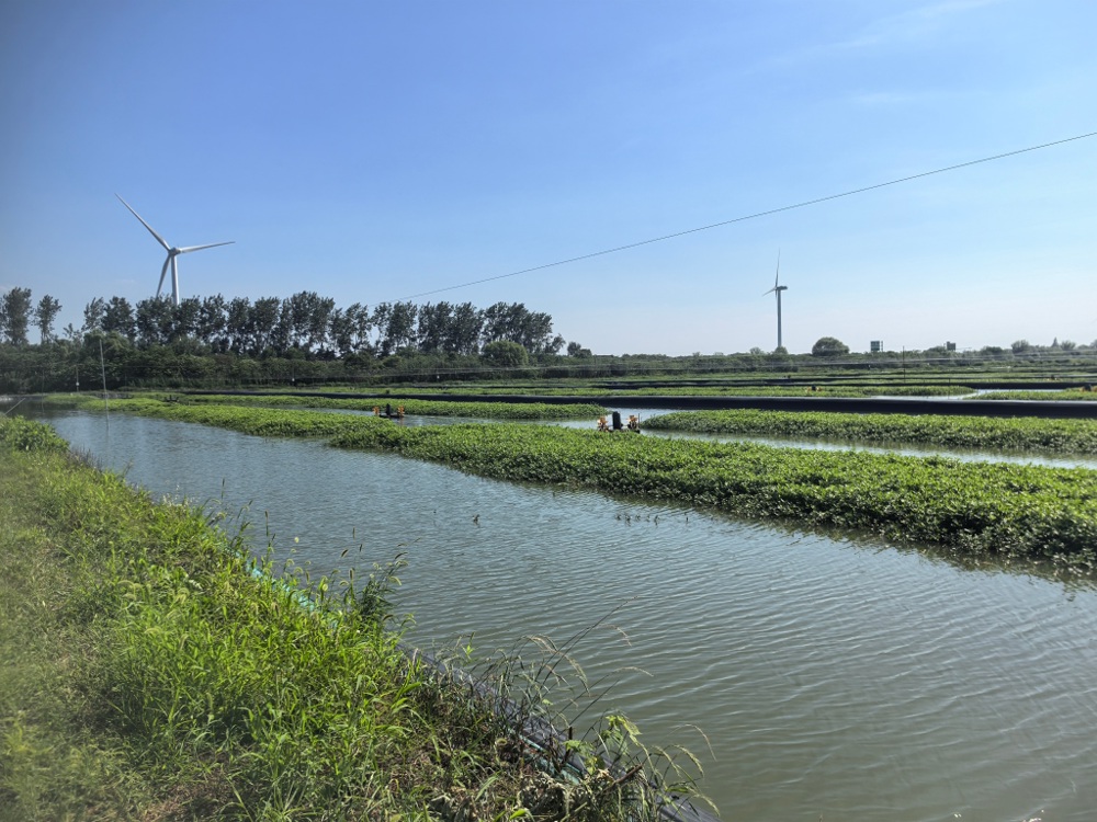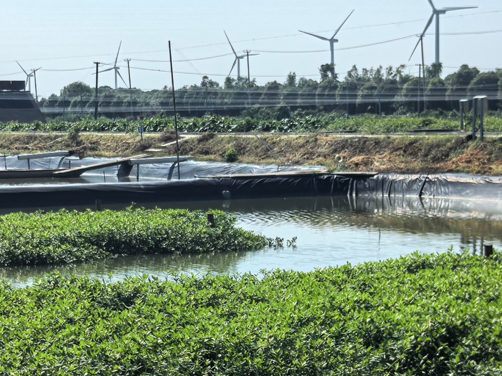 7月22日下午时分,团队成员陆续抵达消泾村村委会,在与当地工作人员的沟通指引下,成员们前往“一号基地”实地参观。此时还未至螃蟹丰收时节,蟹农们早早投喂下饲料便离去,除却细密的蝉鸣,唯有增氧设备激起的水花起落有序,与之应和。消泾村养蟹业始于上世纪90年代初,发展至今已初具规模,规整的养殖塘块,如棋盘般铺展,水体清澈,周边树木成林,与养殖区形成和谐生态系统。