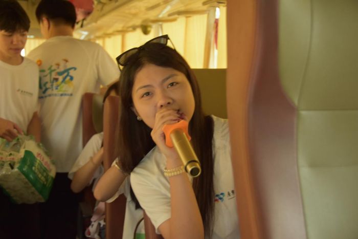 车上队员激情演唱(王婧颐摄)
